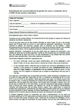 El Departament de Salut ens demana que us fem arribar el document Autorització per al procediment de gestió de casos i contactes de la COVID-19 als centres educatius. L’objectiu de demanar aquesta autorització a totes les famílies dels centres educatius de Catalunya és agilitzar els procediments en cas de tenir positius de COVID-19 al centre. Es demana que: