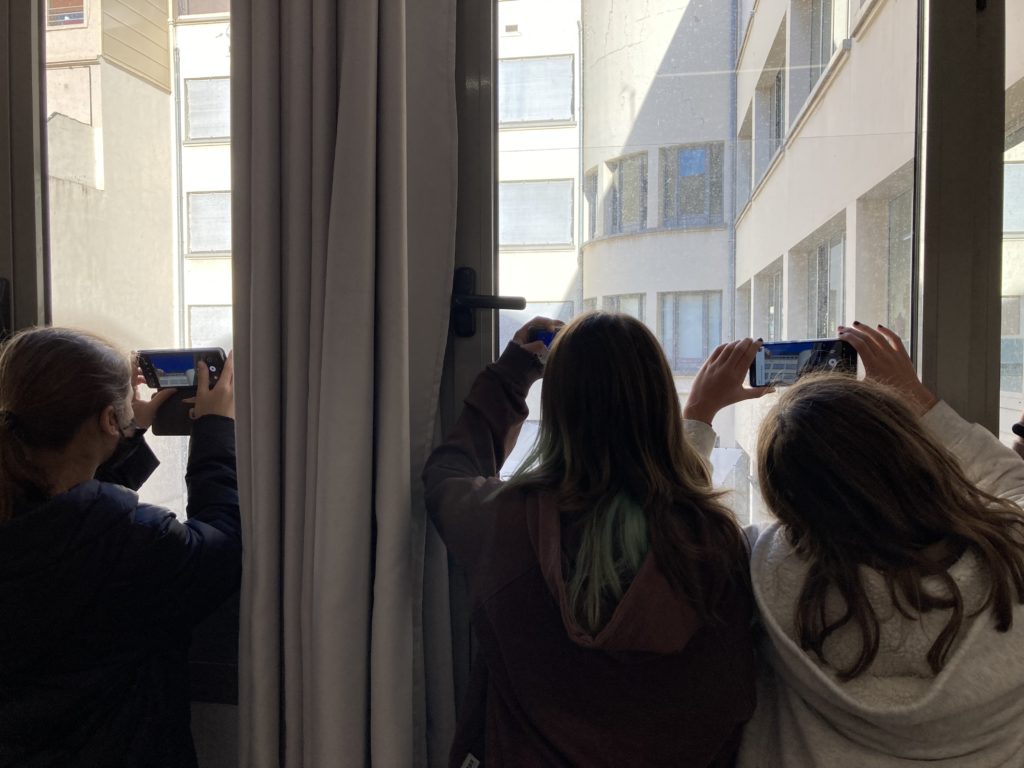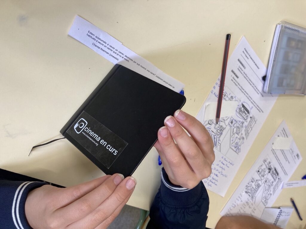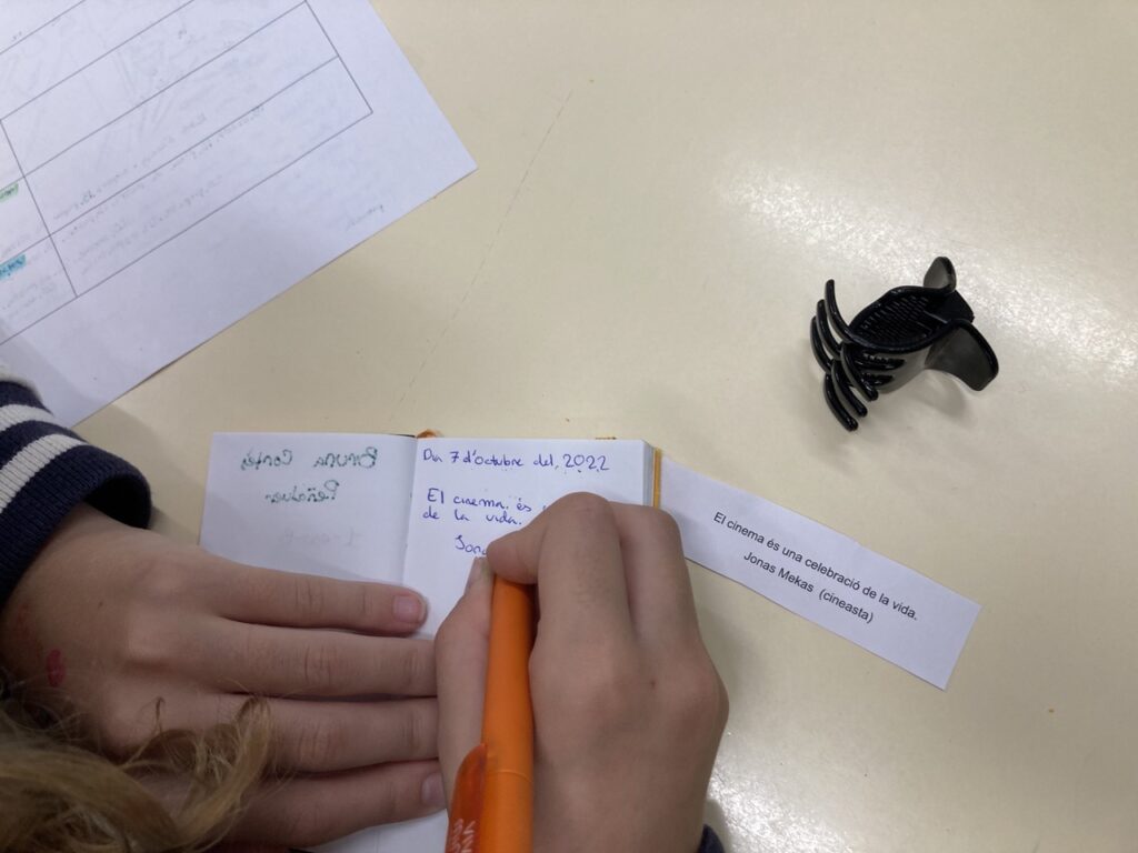 Preparem totes les nostres pràctiques mirant visionats de directors de cinema com Perlov, Guerín i altres. Tot l’alumnat apunta i expressa a la llibreta de Cinema en Curs, allò que descobreix al fer visionats. Parlem de la llum, de què ens vol transmetre el director, el color, l’enfoc, els plans etc… Un moment per parar a compartir també les nostres creacions.