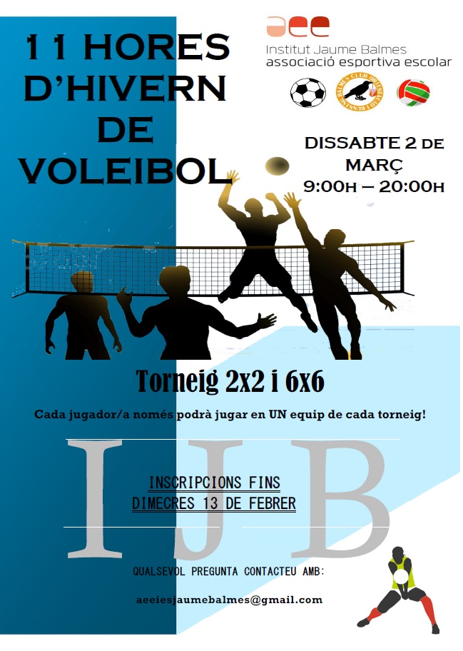 11 HORES d’HIVERN de VOLEIBOL AL BALMES(De 9h a 20h)Benvolguts i benvolgudes;Sabem que ja teniu “mono” de voleibol, i és per això que us presentem les 11 hores de voleibol del Balmes!Després de 4 mesos d’entrenaments, partits, Copa CEEB, fases d’ascens, tornejos… arriben les esperades 11h d’hivern del 2019 amb més partits que mai.Ja tens equip per participar al 6×6?Ja tens parella per participar a l’apassionant 2×2?Us animem a que feu algun equip i que animeu també a tothom a participar-hi.Al llarg de tot el dia tindrem servei de bar, activitats musicals, rifes i moltes altres activitats.A tenir en compte:– El torneig serà una competició 6×6 i tindrem 3 pistes de joc. Recomanem que feu equips de mimin 7 persones.– Al mateix temps s’organitzarà un torneig 2×2 al gimnàs en 2 camps petits amb sistema d’eliminatòries tipus Copa després d’una primera fase de grups de 3 equips. Hi haurà 2 campionats: 2×2 d’iniciació (fins a 3r ESO) i 2×2 d’elit (+ 3r ESO)– Cada equip haurà de decidir un nom, un color de samarreta i un responsable d’equip.– Cal omplir el link d’inscripció que us adjuntem. Teniu temps fins dimecres 13 de febrer.– Dilluns 18 de febrer a les 11h a la sala d’actes es farà el sorteig dels 2 tornejos.– Uns dies abans de les 11 hores (el 22 de febrer), us enviarem les normes de competició, reglament i horaris dels partits