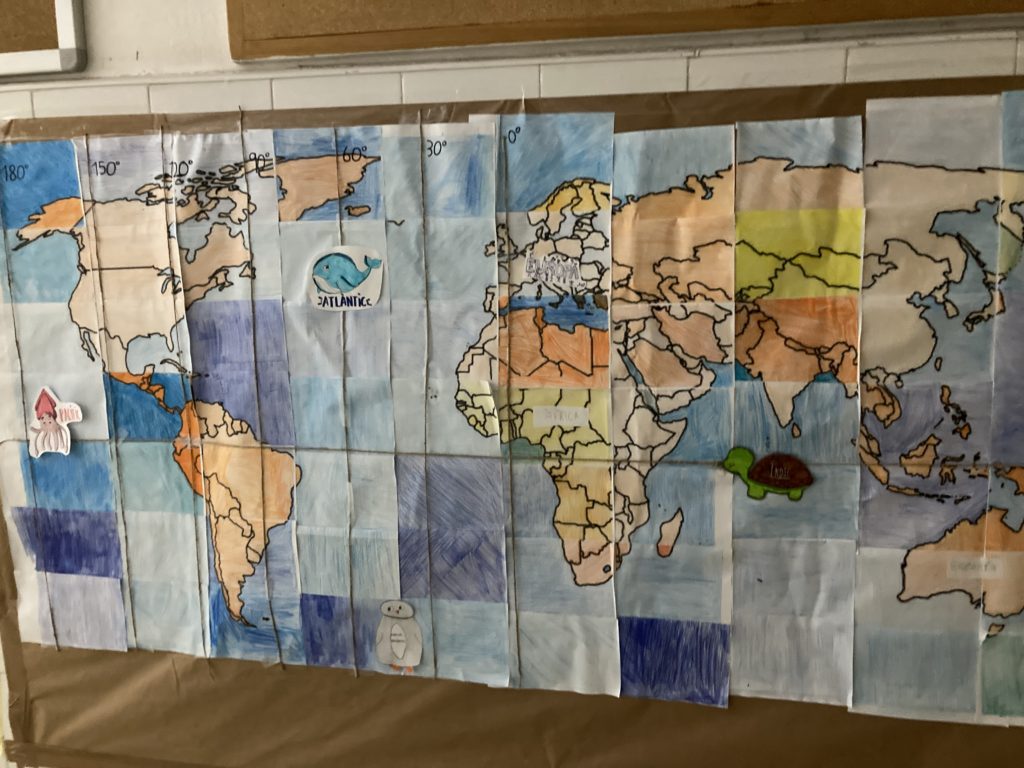 Al mapa que tenim penjat al passadís del centre, hem marcat els meridians i els paral·lels amb els graus corresponents, l’Equador i el meridià de Greenwich, així com els noms dels continents i els seus oceans.