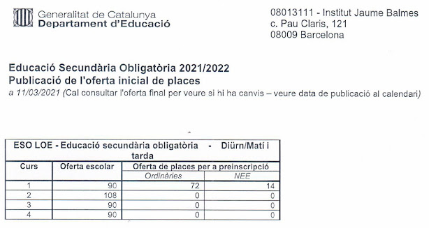 11 març Oferta inicial preinscripció ESO curs 2021-2022