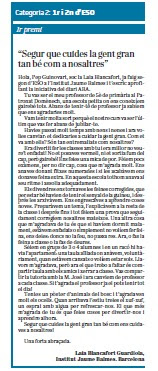 La Laia Blancafort Guardiola d'ESO2C ha obtingut el 1r premi en la Categoria de 1r i 2n d'ESO del concurs ‘Ens estimem l’escola’ que ha organitzat el diari ARA on els nois i noies que han participat escrivint cartes escrites als seus mestres. ...