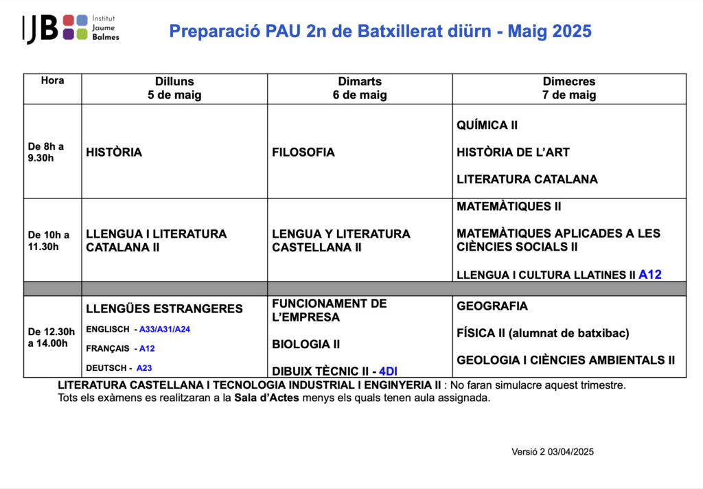 A continuació us deixem els horaris de les proves de preparació per a les PAU. Aquestes tindran lloc des del dilluns dia 5 de maig al dimecres 7 de maig.