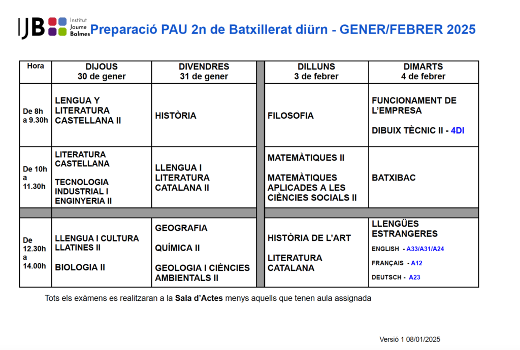 A continuació us deixem els horaris de les proves de preparació per a les PAU. Aquestes tindran lloc des del dijous dia 30 de gener fins el dimarts dia 4 de febrer.