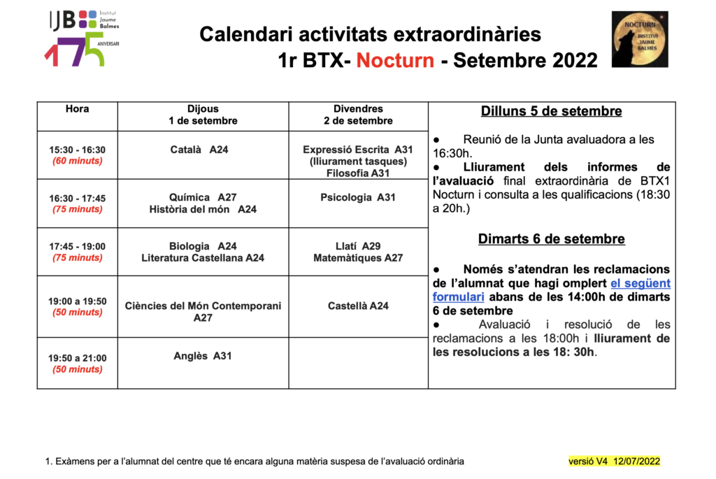 A continuació us compartim el calendari d’activitats extraordinàries de setembre per a l’alumnat amb matèries pendents de 1r de Batxillerat NOCTURN. Feu clic sobre la imatge per veure’l ampliat i per omplir el formulari en cas de reclamacions: