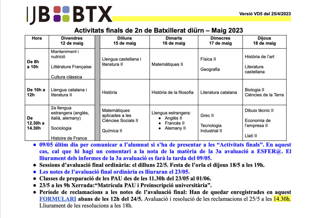 A continuació podeu trobar el calendari amb les activitats finals de BATX2 diürn, així com altres informacions del vostre interès: