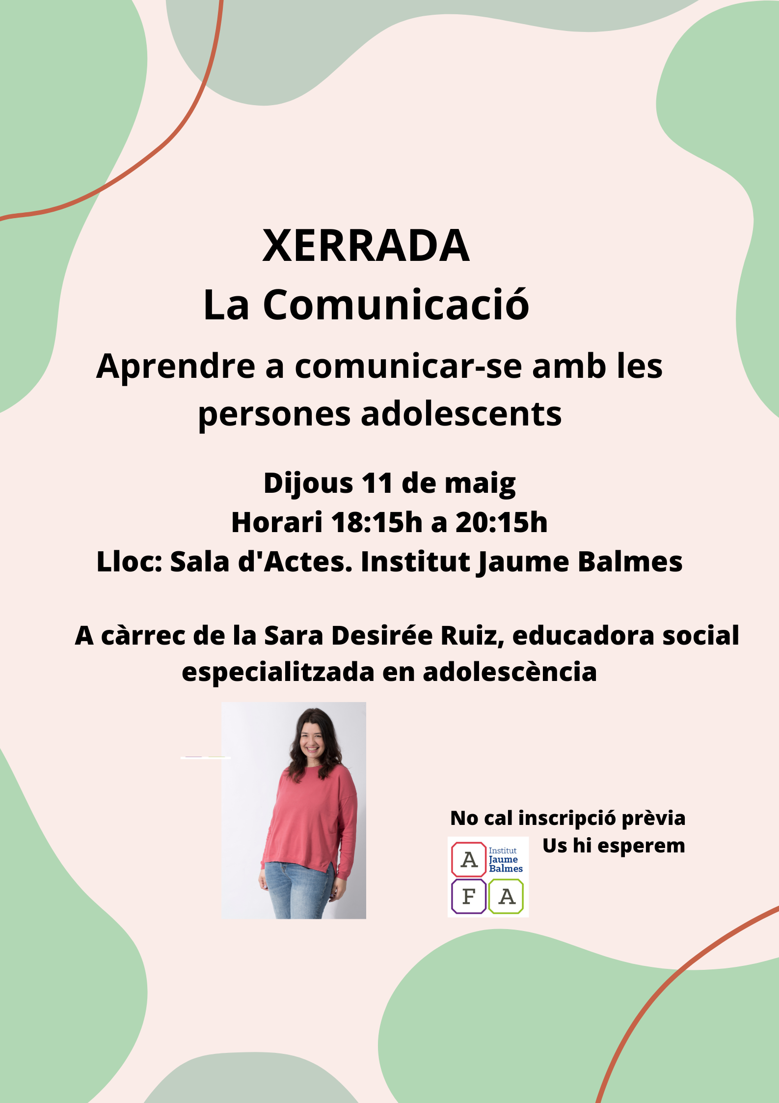 [vc_row css_animation="" row_type="row" use_row_as_full_screen_section="no" type="full_width" angled_section="no" text_align="left" background_image_as_pattern="without_pattern"][vc_column][vc_column_text] [/vc_column_text][vc_empty_space][/vc_column][/vc_row][vc_row css_animation="" row_type="row" use_row_as_full_screen_section="no" type="full_width" angled_section="no" text_align="left" background_image_as_pattern="without_pattern"][vc_column width="1/2"][vc_column_text]Un altre cop la ponent Sara Desirée Ruiz, educadora especialitzada en adolescència (va fer una exitosa xerrada l'any 2022), ens acompanyarà en una xerrada gratuïta, que pinta molt bé. TÍTOL: La Comunicació:...