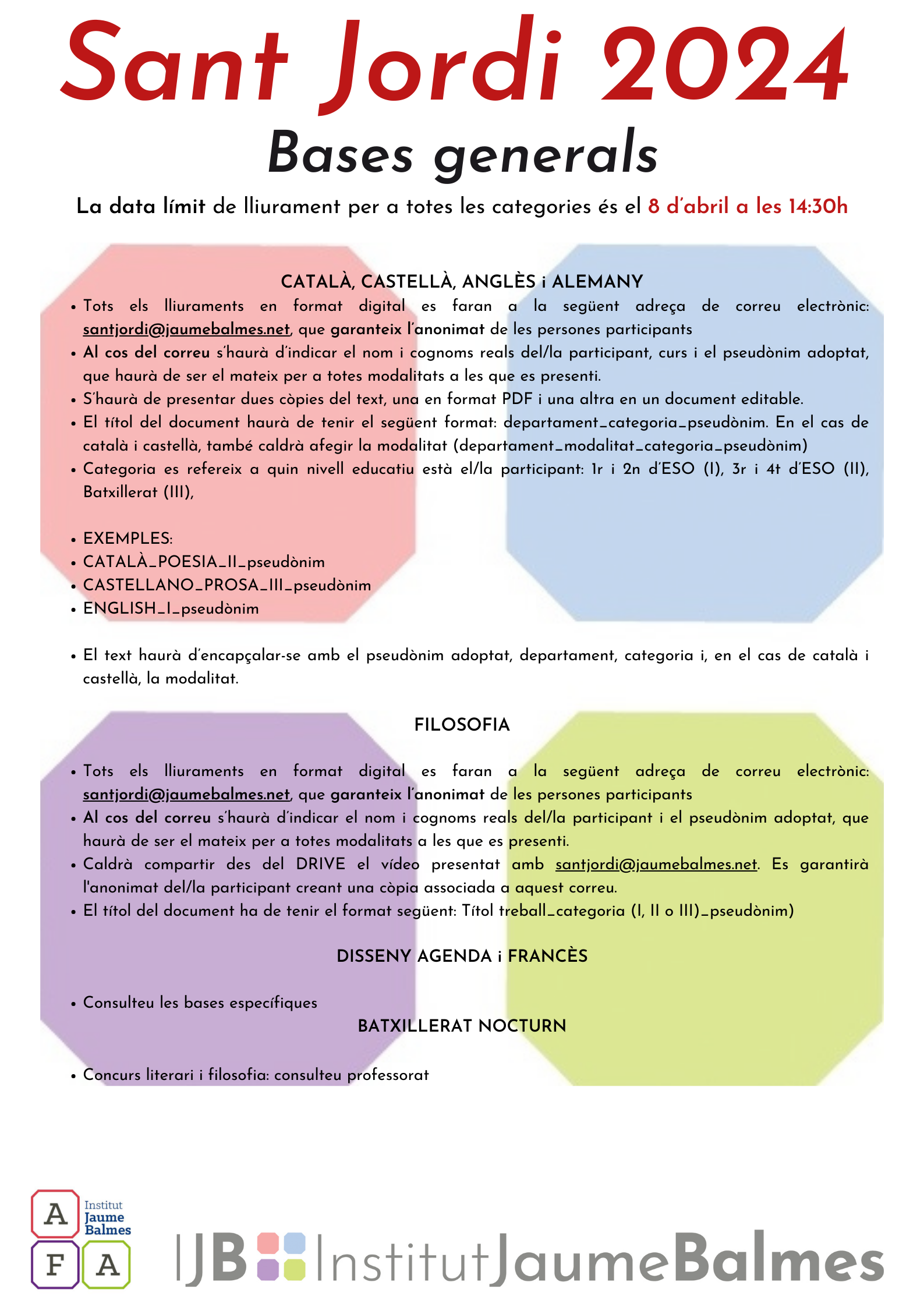 [vc_row css_animation="" row_type="row" use_row_as_full_screen_section="no" type="full_width" angled_section="no" text_align="left" background_image_as_pattern="without_pattern"][vc_column][vc_column_text] [/vc_column_text][vc_empty_space][/vc_column][/vc_row][vc_row css_animation="" row_type="row" use_row_as_full_screen_section="no" type="full_width" angled_section="no" text_align="left" background_image_as_pattern="without_pattern"][vc_column width="1/2"][vc_column_text]A continuació us presentem els diferents concursos dels Jocs Florals d’aquest Sant Jordi 2024 i les bases de participació. A la imatge de la dreta podeu llegir la informació general....