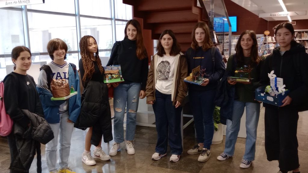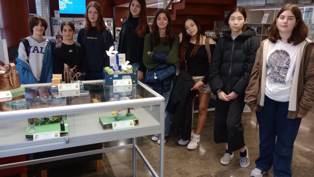 Les imatges mostren el moment en què les alumnes fan l’entrega dels seus treballs a la biblioteca Sofia Barat, on seran exposades. Com es pot apreciar, es prepara l’estant amb les cinc millors obres que representen al nostre centre.