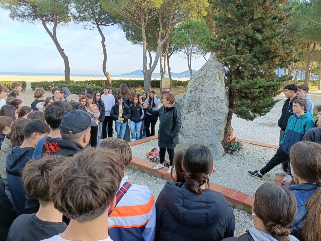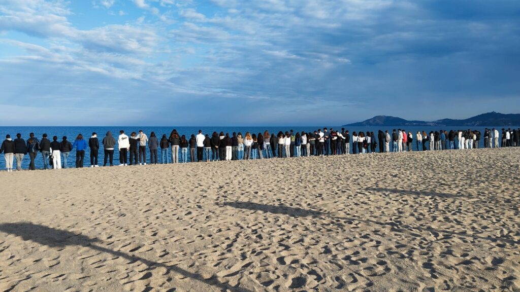 La tercera i última visita ha estat a la platja d’Argelers. L’Assumpta Montellà ens ha detallat la duresa terrible i inhumana del camp de refugiats que es va establir allà. Alguns alumnes han llegit textos relacionats amb l’exili de la Guerra Civil espanyola i el camp d’Argelers. Finalment, hem fet un minut de silenci sobre la sorra de la platja.