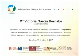 En una notícia anterior, “Èxit a les olimpíades Catalanes de Geologia (3/2/2017) i Biologia (4/2/207)“, ja us vam explicar que en Pau Casanovas i en Nil Salvat van estar seleccionats per participar a la 2a fase (part pràctica) de l’olimpíada de Biologia.