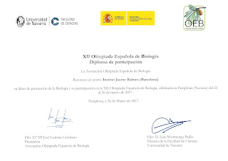 Del 23 al 26 de març de 2017 es va celebrar la XII Olimpíada Española de Biologia a Pamplona (Navarra) a la qual van assistir els nostres dos alumnes, Pau Casanovas Calus i Nil Salvat Rovira, acompanyats de la seva professora Mª Victoria Garcia Bernabé.