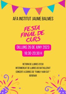 El proper dilluns 26 de juny tindrà lloc la Festa de Final de Curs de l’Associació de Famílies de l’Institut Jaume Balmes. Serà de 18:30 a 20:30. Podreu retornar els llibres de l’ESO, intercanviar llibres de BATX, gaudir del concert a càrrec de “Family Haircut” i berenar. Us hi esperem!