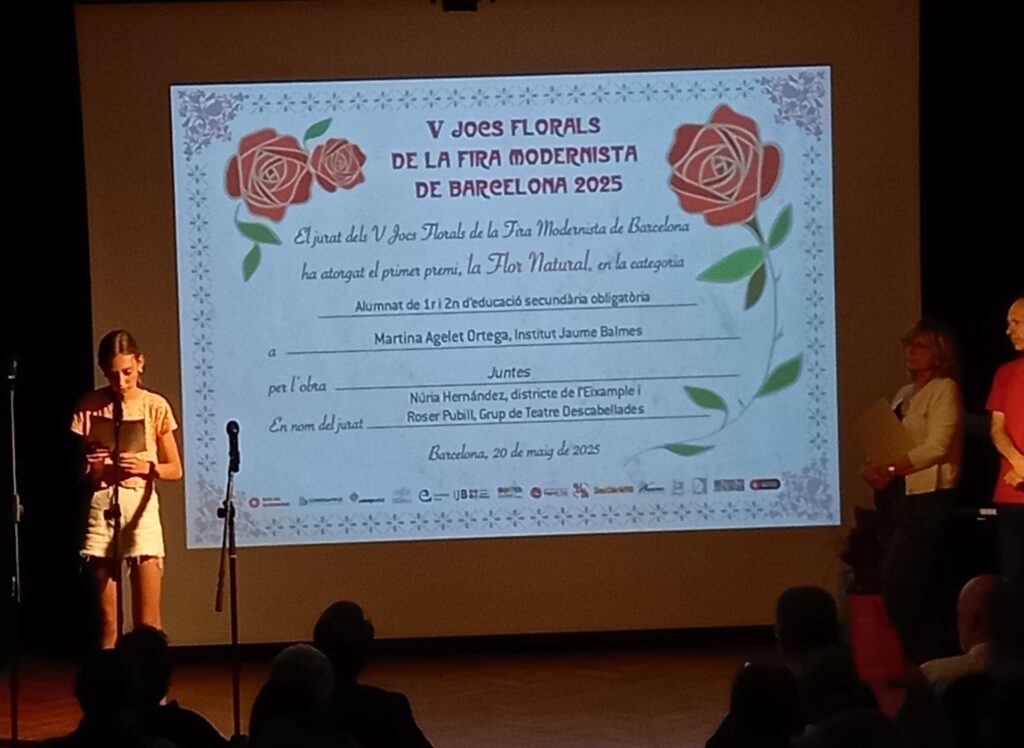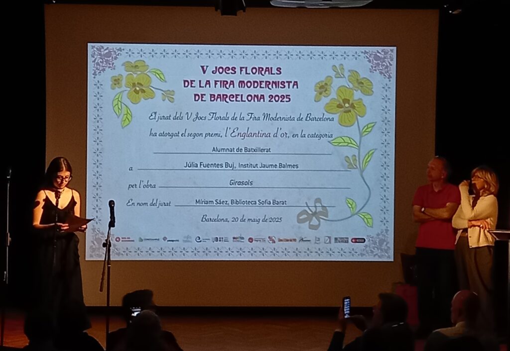 I un any més, celebrem el reconeixement que han rebut quatre alumnes del nostre institut. El primer premi, la Flor Natural, de la categoria D, d’alumnes de primer i segon d’ESO, ha estat per a Martina Agelet Ortega; el segon premi de la categoria F, d’alumnes de Batxillerat, ha estat per a Júlia Fuentes Buj; el tercer premi de la mateixa categoria, per a Mariona Ortiz Andreu, i, finalment, el tercer premi de la categoria D, d’alumnes de primer i segon d’ESO, ha estat per a Paulina Belmonte Puig.