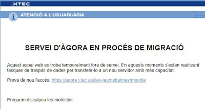Avui a la tarda ens han trucat del Departament d’Educació per dir-nos que vist que som un centre molt actiu en el Moodle-Àgora i que estem tenint molts problemes de connexió, especialment a partir d’avui 14/4, en què molts centres han començat a utilitzar la plataforma, ens faran una migració de tot el nostre Moodle a un nou servidor amb més capacitat.