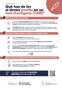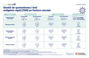 Us compartim dues infografies on es recullen els protocols de gestió de les quarantenes i d’un cas positiu per test d’antígens, ambdues publicades per Salut i la Generalitat de Catalunya. Cliqueu sobre les imatges per veure-les correctament. A més, recordeu notificar-ho al tutor o tutora del vostre fill o filla.