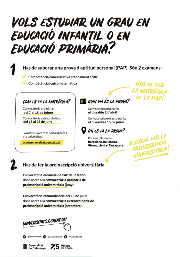 També, a partir d’avui dia 7 i fins el 15 de febrer es pot realitzar la  matrículació de les Proves d’Aptitud Personal  (PAP d’Educació);  aquestes proves van dirigides als alumnes que vulguin cursar Educació Infantil  o Educació Primària. Feu clic sobre la imatge per veure-la ampliada.