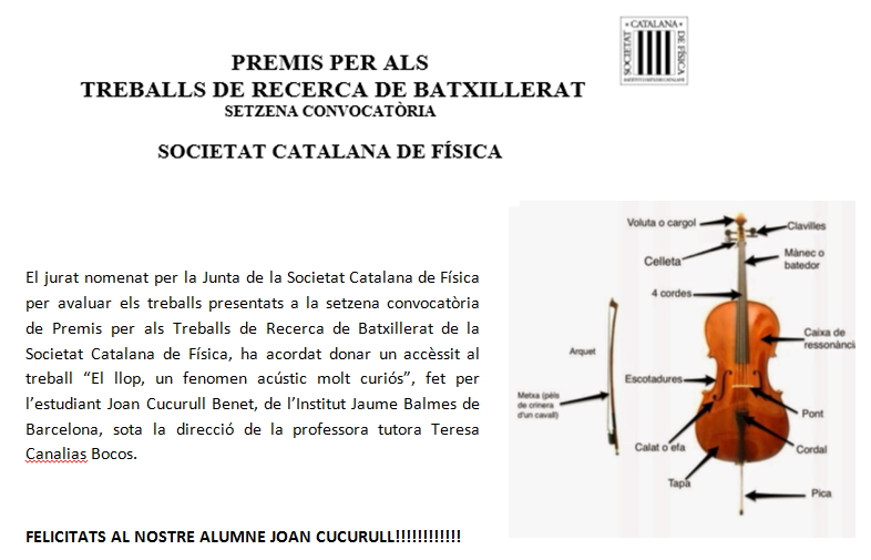El jurat nomenat per la Junta de la Societat Catalana de Física per avaluar els treballs presentats a la setzena convocatòria de Premis per als Treballs de Recerca de Batxillerat de la Societat Catalana de Física, ha acordat donar un accèssit al treball “El llop, un fenomen acústic molt curiós”, fet per l’estudiant Joan Cucurull Benet, de l’Institut Jaume Balmes de Barcelona, sota la direcció de la professora tutora Teresa Canalias Bocos.