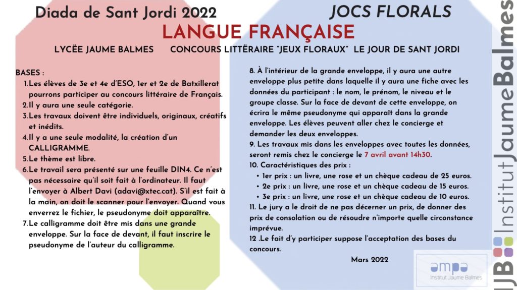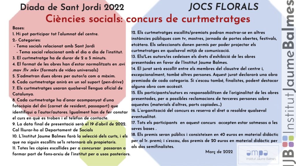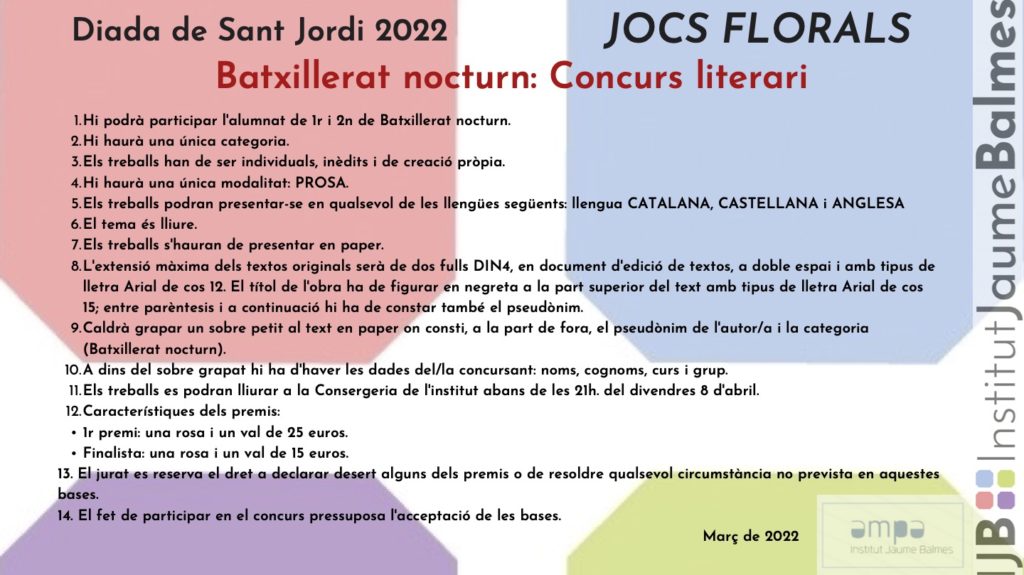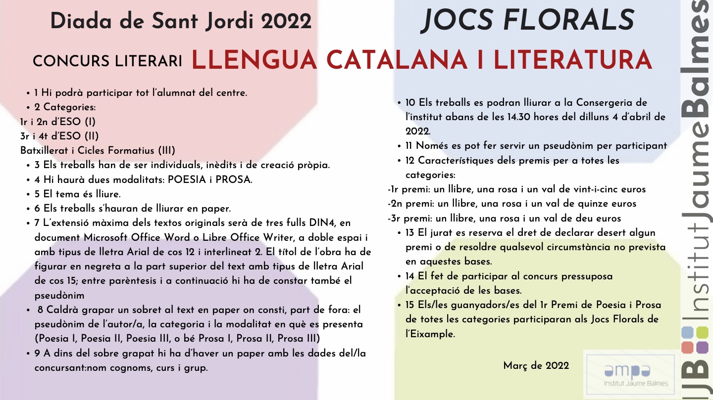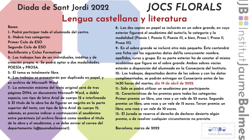A continuació us presentem els diferents concursos dels Jocs Florals d’aquest Sant Jordi 2022 i les bases de participació: