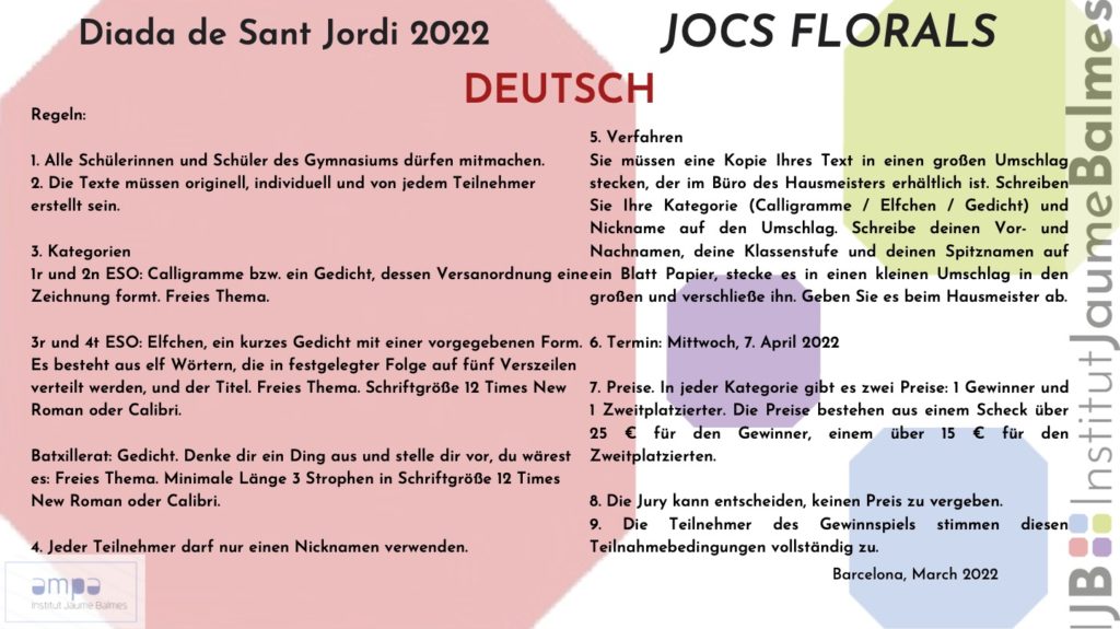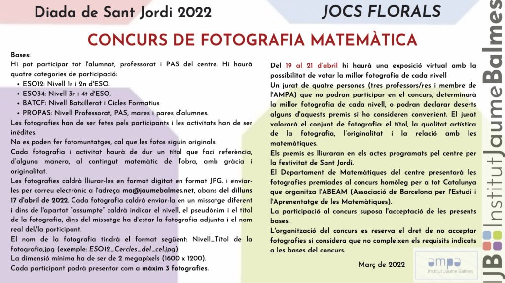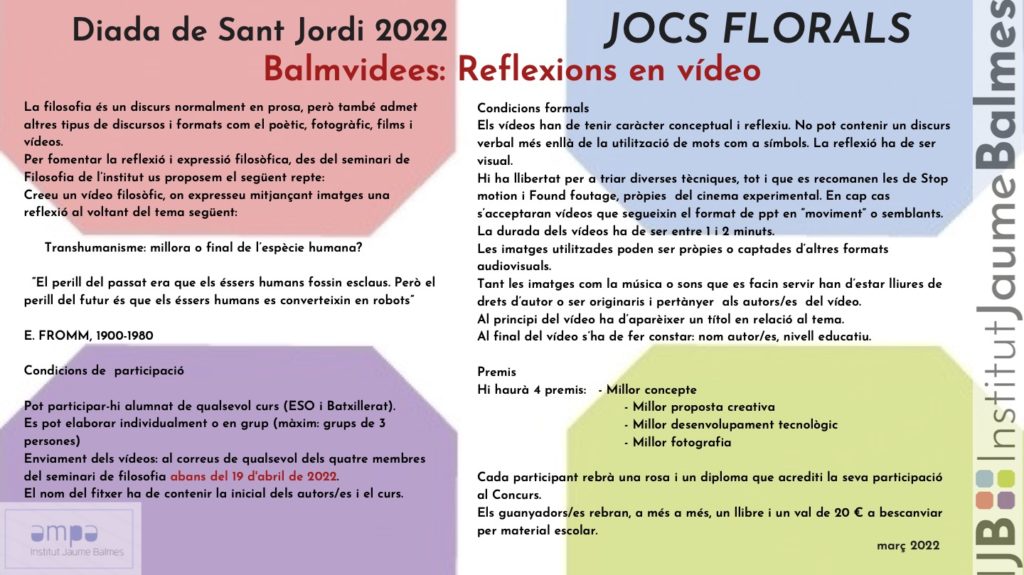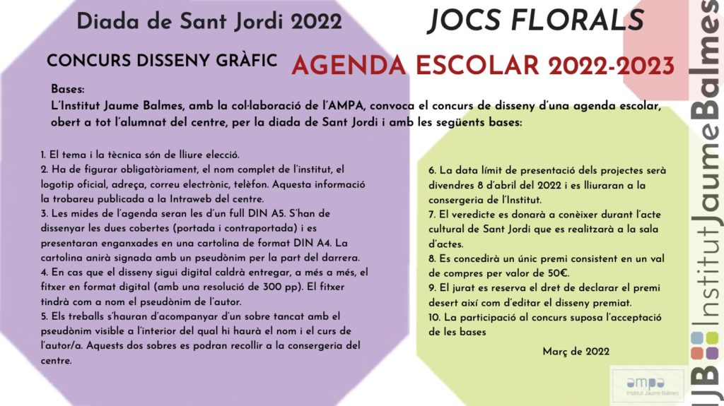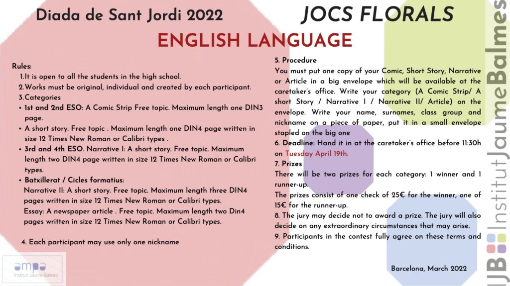 A continuació us presentem els diferents concursos dels Jocs Florals d’aquest Sant Jordi 2022 i les bases de participació: