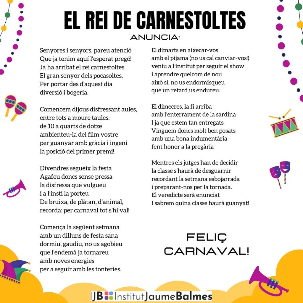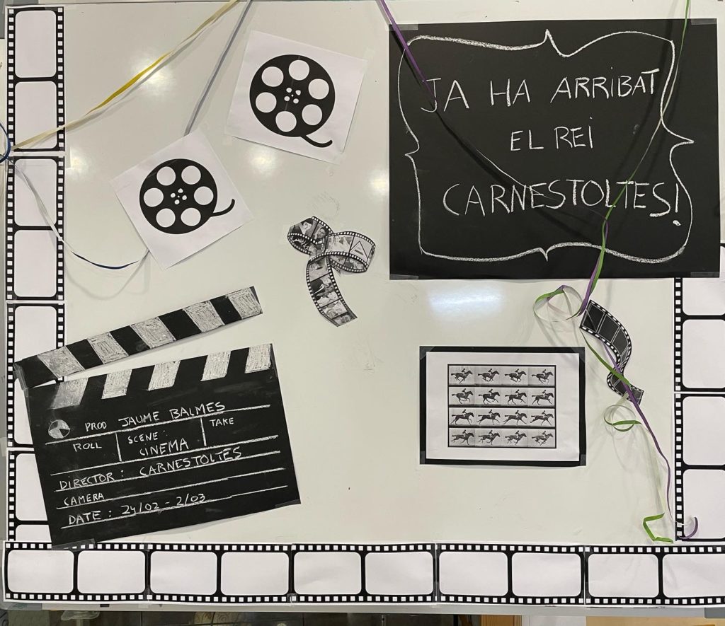 Avui, Dijous Gras, hem començat la festa veient el pregó. Després hem seguit la disbauxa carnavalera disfressant cada grup la seva aula. El tema va de CINEMA i per això totes les aules són el paisatge o decorat d’una pel·lícula que cada grup ha triat. Més tard tothom ha pogut desfilar pels passadissos amb un ordre mil·limetrat per valorar les aules disfressades. I cada grup ha tingut una estona per fer festa al pati presentant el tema de la seva disfressa i fent una foto de grup. Cadascú votarà després per decidir quina és l’aula més ben disfressada.